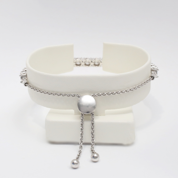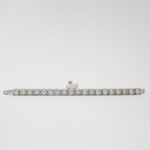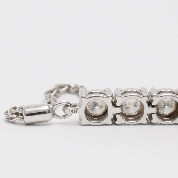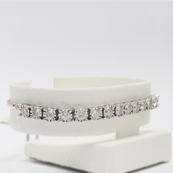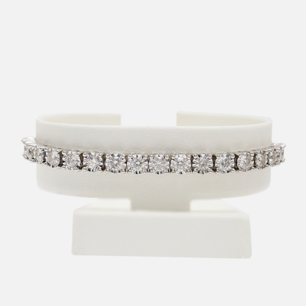 Această brățară frumoasă are 19 diamante set iluzii și o închizătoare tip basculă pentru o dimensiune reglabila. Greutatea totală este de 12,2 grame.