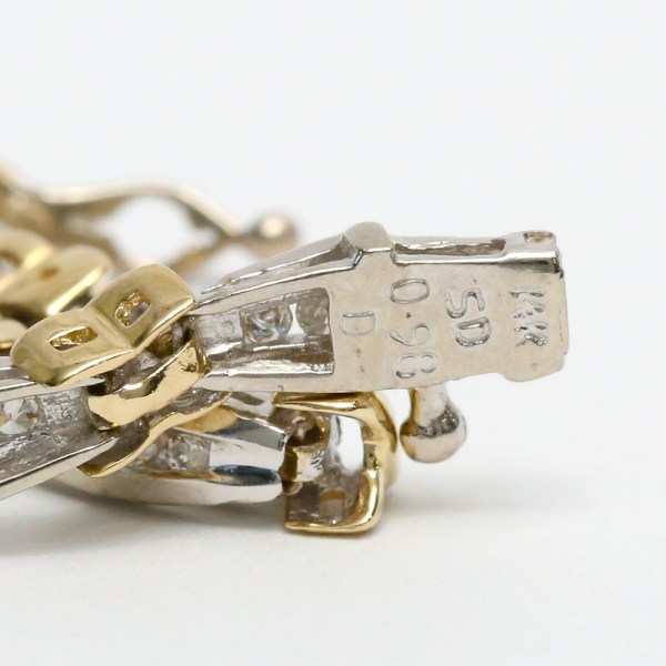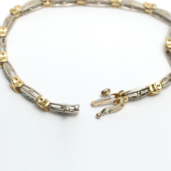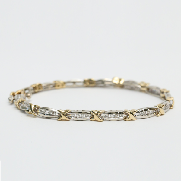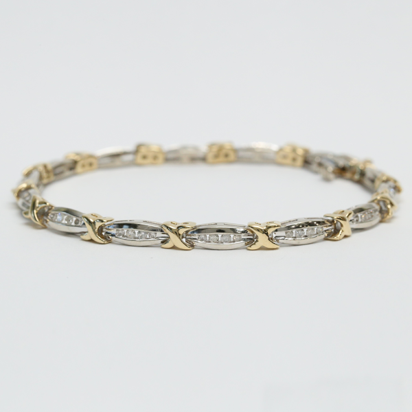 Această brățară frumoasă are legături X din aur galben cu legături alternanțe din aur alb cu diamante rotunde setate de canale. Greutatea totală este de 11,5 grame.