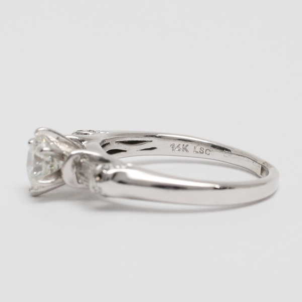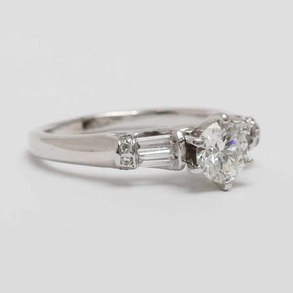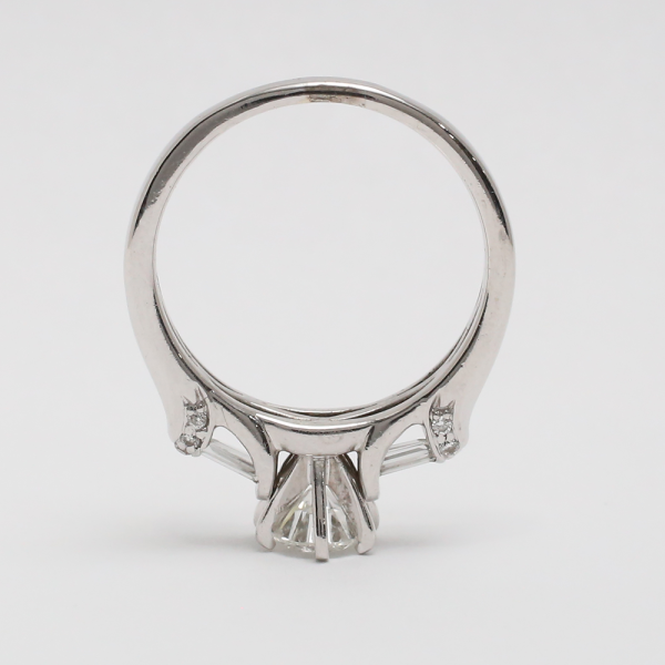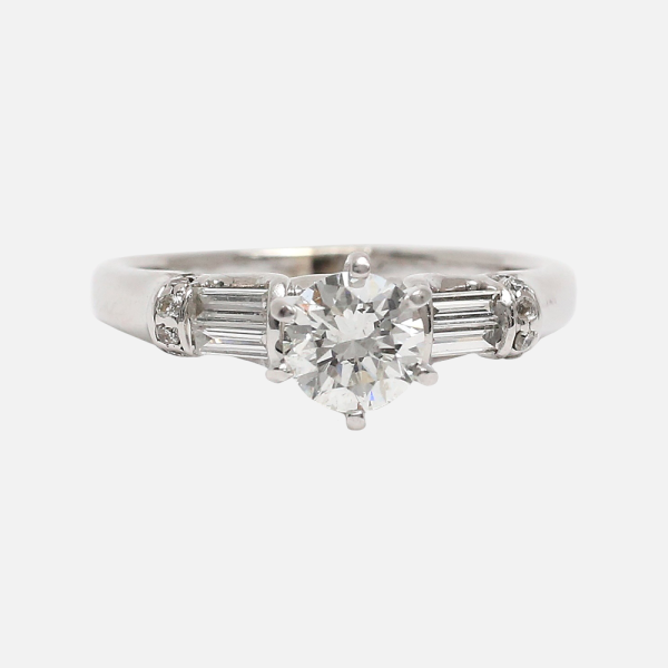 Acest inel frumos are un diamant mare în centru, accentuat de baghete cu set de canale și diamante mici cu șuruburi. Greutatea totală este de 3,8 grame.