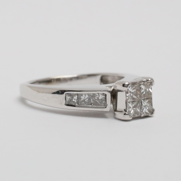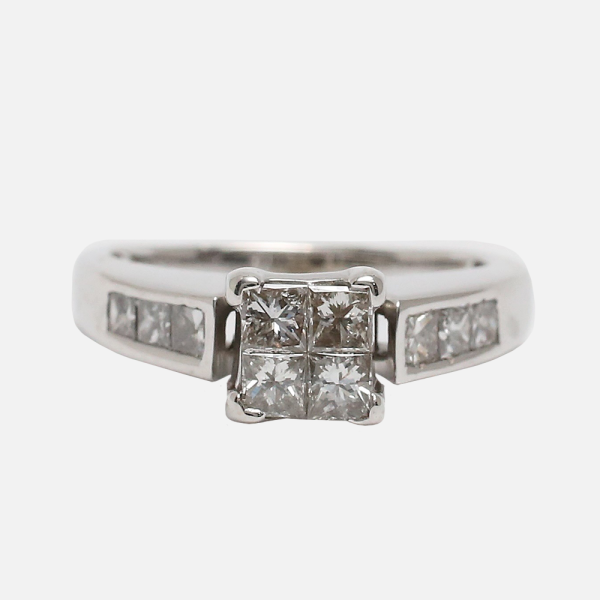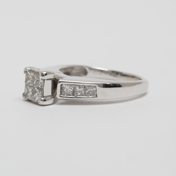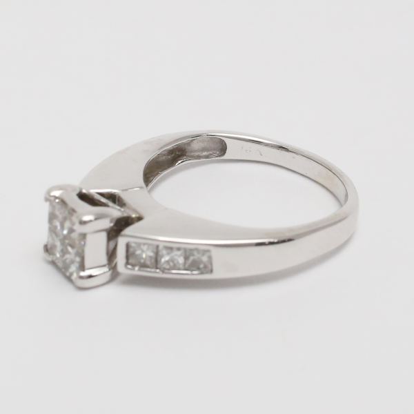 Acest inel frumos are un grup de diamante tăiate prințesă în centru cu diamante fixate pe tijă. Greutatea totală este de 4,0 grame.