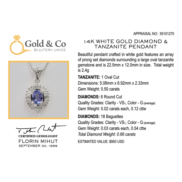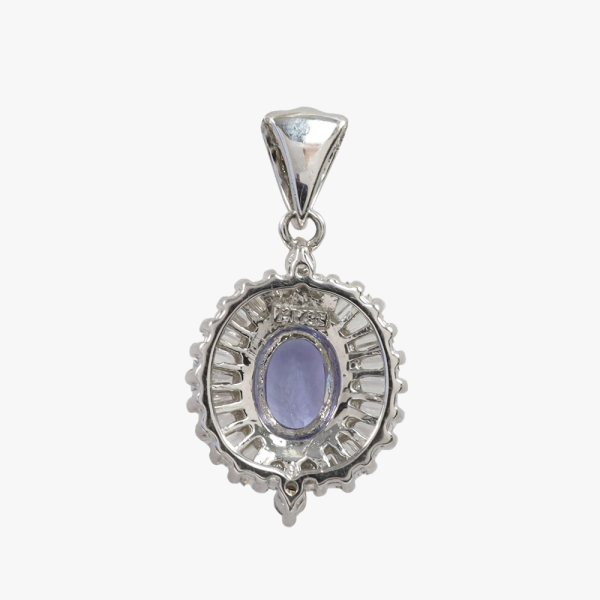 Frumosul pandantiv confecționat din aur alb prezintă o serie de diamante încrustate care înconjoară o piatră prețioasă ovală mare de tanzanit. Greutatea totală este de 2,4 grame